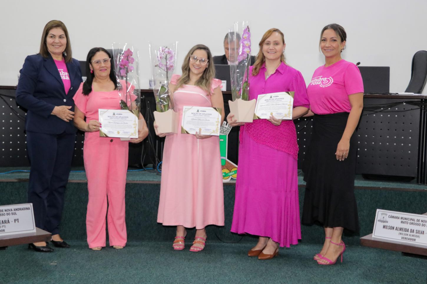 O plenário se encheu de aplausos quando foram homenageadas Daiara Neves dos Santos, Kathusca Tathiane Silva Rodrigues Nogueira e Maura Rodrigues dos Santos, três guerreiras que enfrentaram o câncer com fé e coragem, tornando-se símbolo de inspiração para tantas outras mulheres. Suas histórias, cheias de resiliência e amor à vida, foram reunidas em um vídeo produzido pela Assessoria de Comunicação da Câmara, em parceria com a enfermeira Ingrid Souza Anuto, do Hospital de Amor de Nova Andradina, e com o apoio da empresa QI Propaganda. Todas elas foram surpreendidas com uma Moção de Aplausos, entregue pelas vereadoras e procuradoras, Gabriela Delgado e Márcia Lobo.